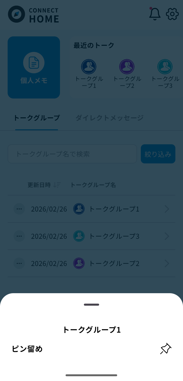 ブラウザ(PC)版: ホーム画面でピンマークのクリック、またはトークグループ一覧の三点リーダー>「ピン留め」で設定
