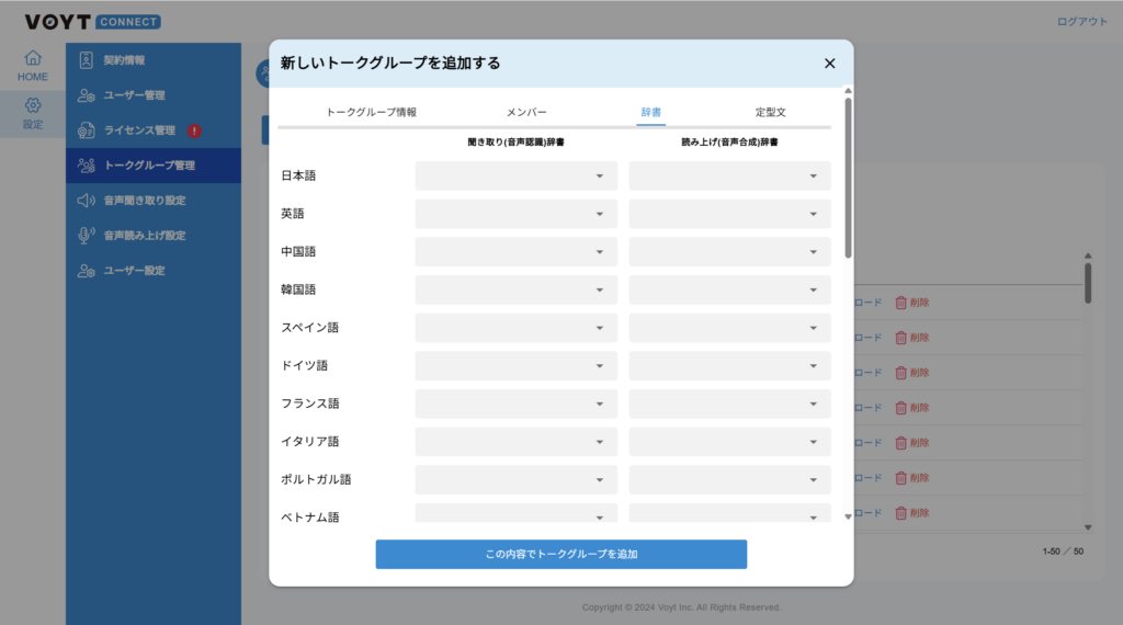 — トークグループの設定画面で言語ごとに聞き取り辞書を設定できるようになりました。